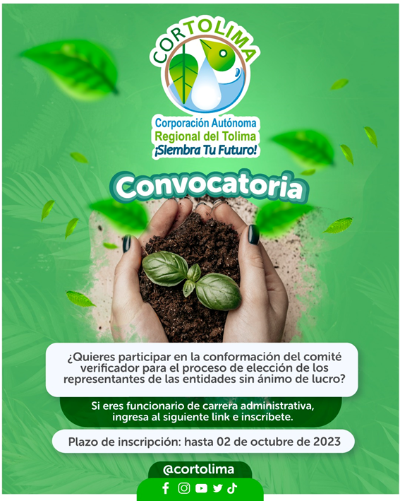 La Corporación Autónoma Regional del Tolima hace extensiva la invitación a los funcionarios de carrera administrativa que quieran participar en la conformación del Comité Verificador para el proceso de elección de los representantes de las Entidades Sin Ánimo de Lucro, ante el Consejo Directivo de Cortolima para el periodo institucional desde el 01 de enero de 2024 hasta el 31 de diciembre de 2027..