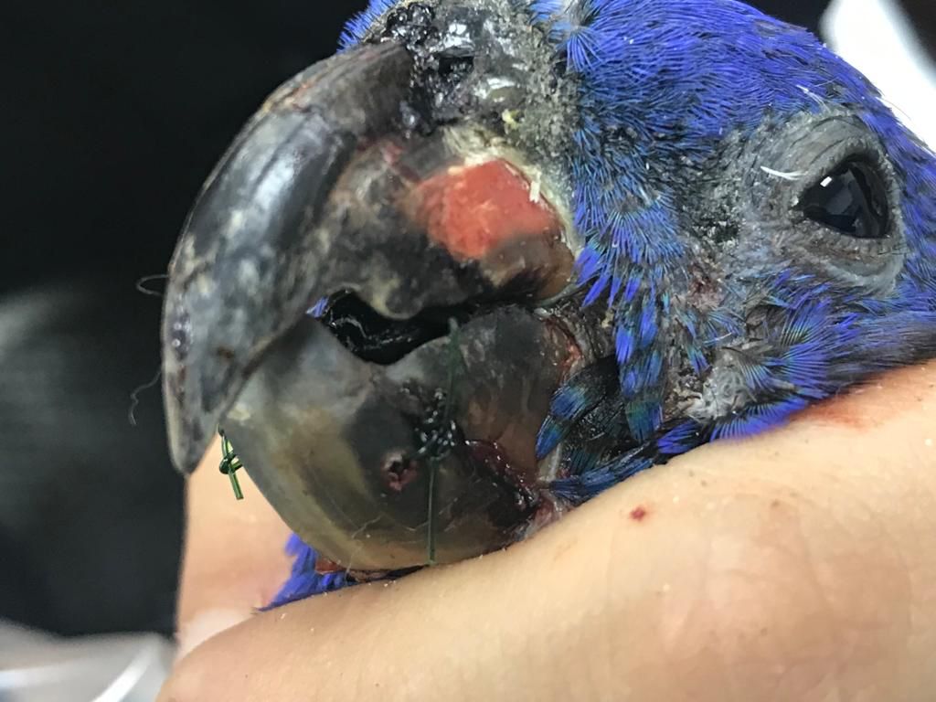 ✅ Al parecer esta especie se encontraba en una casa como mascota de la cual probablemente escapó. Los veterinarios le practicaron una cirugía reconstructiva del pico, que consistió en un cerclaje, es decir, una sutura del pico. Posteriormente se le colocó un acrílico como soporte mientras cicatriza la parte intervenida.