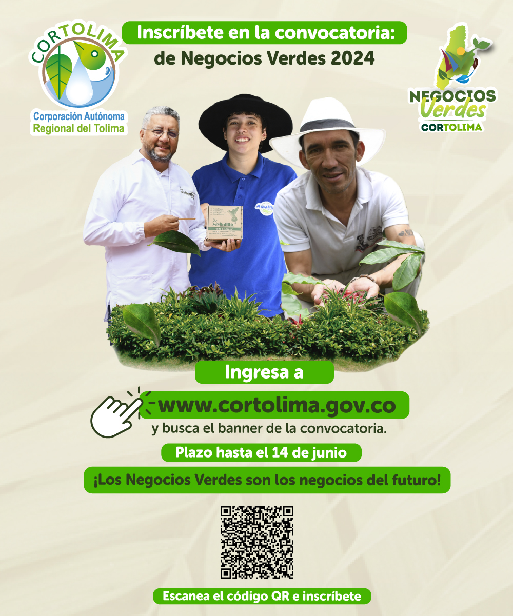 Te invitamos a conocer más de la inscripción al programa de Negocios Verdes de Cortolima aquí: https://cortolima.gov.co/planes-y-programas-0/negocios-verdes/convocatorias/inscripcion-al-programa-de-negocios-verdes-de-cortolima