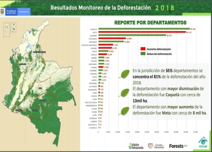 El Ministerio de Ambiente y El Instituto de Hidrología, Meteorología y Estudios Ambientales (IDEAM), publicaron los Resultados “Monitoreo de la Deforestación para el 2018”. El informe muestra como en el 2017 se deforestaron 219.973 hectáreas y para el 2018 197.159 ha, existiendo una disminución de 22.814 ha; aunque para los expertos el panorama sigue siendo preocupante.