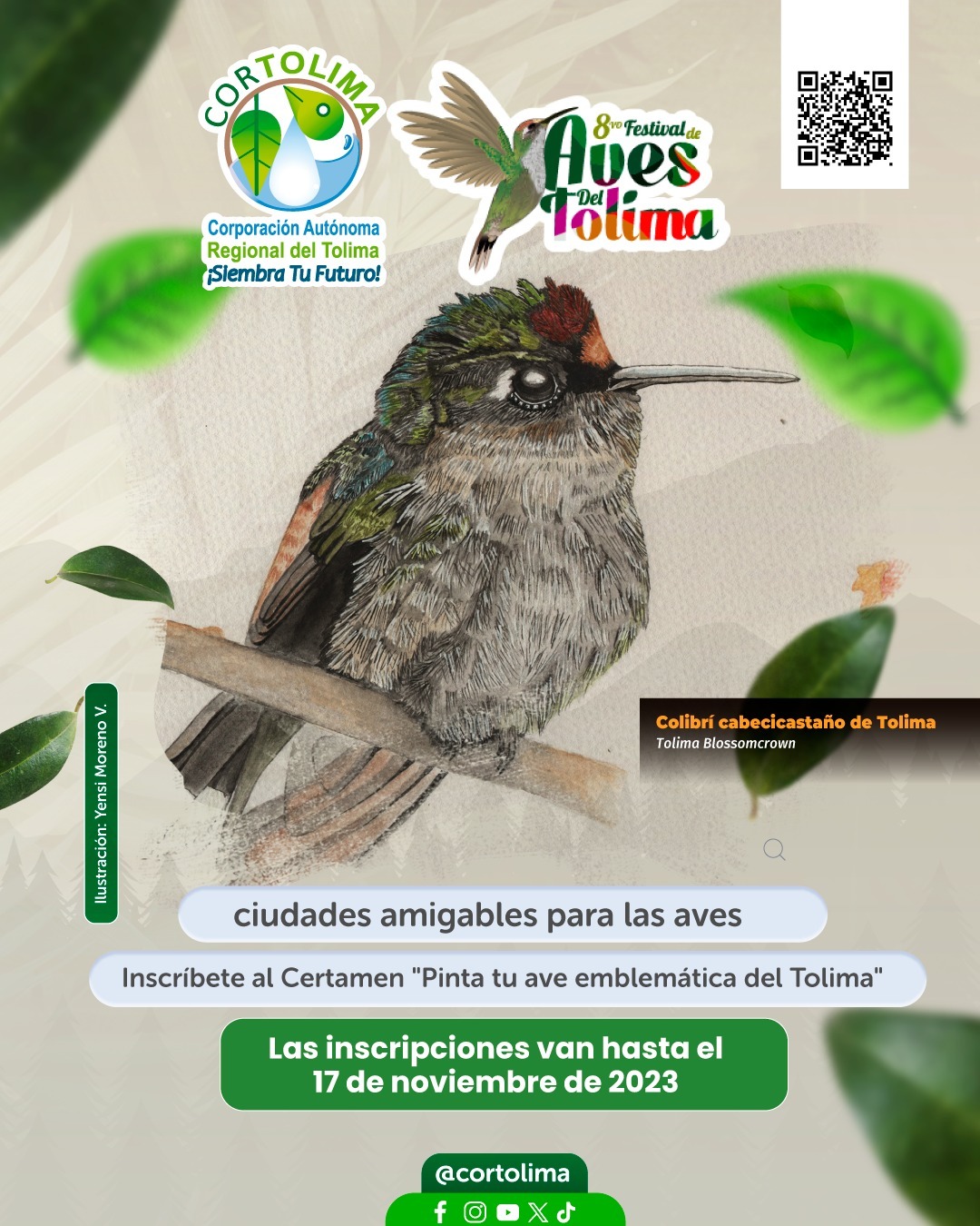 La Corporación Autónoma Regional del Tolima, en el marco de nuestro 8° Festival de Aves del Tolima "Ciudades amigables para las Aves" abre las inscripciones para su Certamen "Pinta tu ave Emblemática", en donde los niños del departamento del Tolima pintarán las 10 aves emblemáticas declaradas por la Asamblea Departamental del Tolima y las declaradas en los diferentes municipios del departamento.