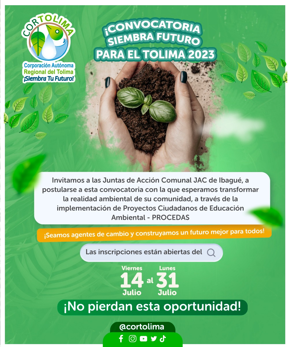 La convocatoria “Siembra Futuro para el Tolima” culminó inscripciones el 31 de julio, con un total de 23 Proyectos Ciudadanos de Educación Ambiental, que contribuirán a la preservación de los recursos naturales de la ciudad.